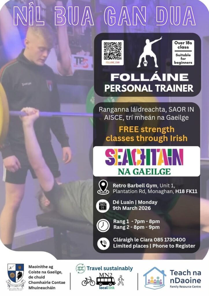 “Níl bua gan dua | No pain no gain” Join us to celebrate Seachtain na Gaeilge. Come along to a FREE strength class suitable for beginners. Learn a few words in Irish, don’t panic, it will be bilingual!! Phone Ciara to register 085 1730400. Kindly funded by Coiste Gaeilge, Comhairle Contae Mhioneacháin. Bí linn chun […]